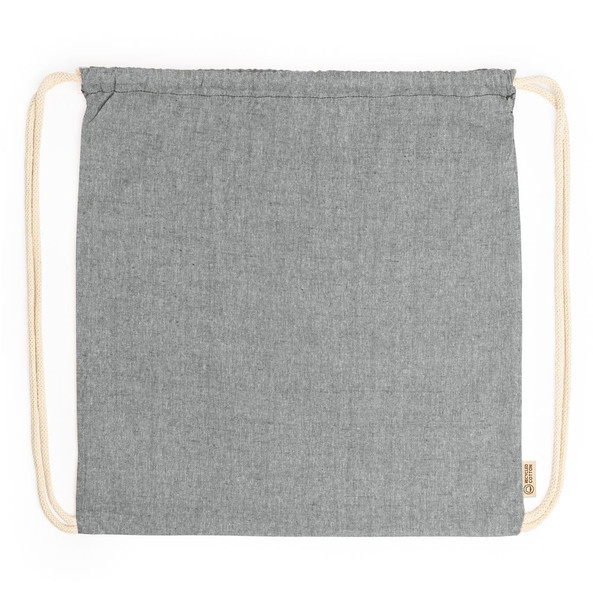 Drawstring bag made of 120 gsm recycled cotton in heather finish and cords in natural colour.