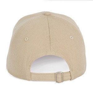 6-panel cap with adjustable self-locking metal buckle.