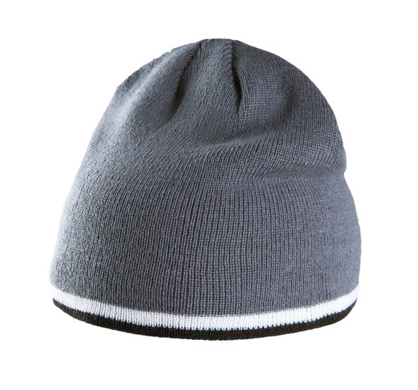 100% acrylic. Knitted beanie hat with contrast bi-colour bottom band.