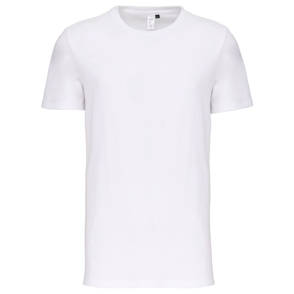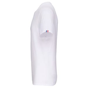 Blue/white/red clip label at hem of left sleeve garment worn.