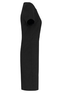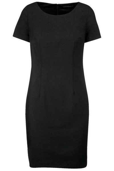 It's a knee-length, short-sleeved dress with a stretchy lining.