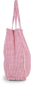 This bag has 55cm handles and is designed in a square shape with dyed fabric stripes and an inside zippered pocket.