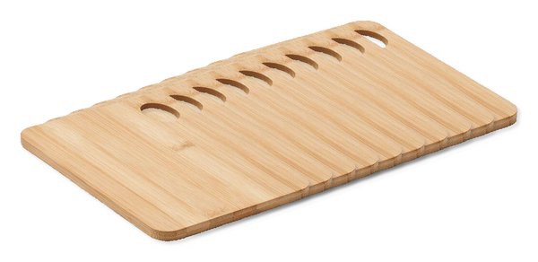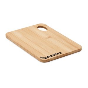 Bamboo cutting board with hanging hole, perfect for sustainable food prep and custom promotional engraving. This 21.5x15x1cm board offers a durable, natural surface for daily kitchen tasks or serving. Made from eco-friendly bamboo, it provides a sturdy alternative to plastic. Its compact size makes it easy to store or display using the integrated hanging hole. For businesses, this blank board serves as a high-quality canvas for corporate gifts, restaurant branding, or retail resale. Please note that natural variations in wood grain ensure every piece is unique, adding to its authentic charm. Available for bulk purchase and wholesale orders.