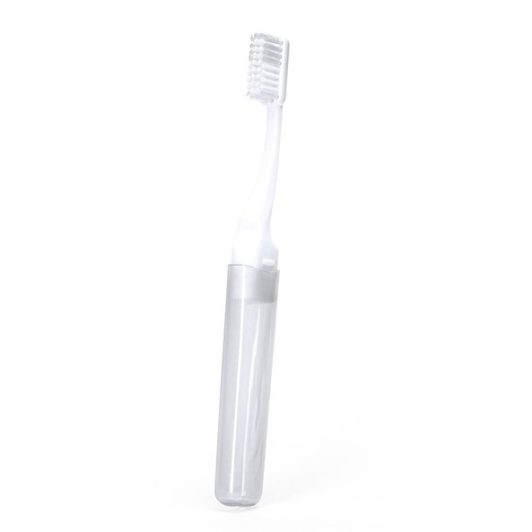 Travel toothbrush with translucent cap and two-tone matching soft bristles.