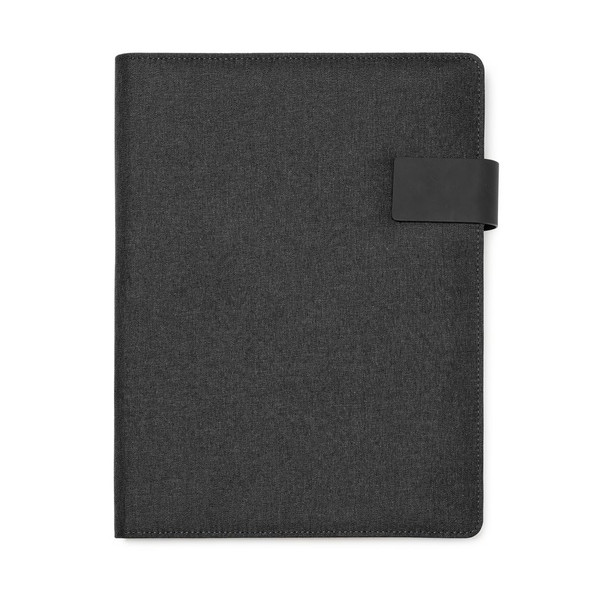 Multipurpose A4 folder in heather 600D RPET with magnetic clasp.