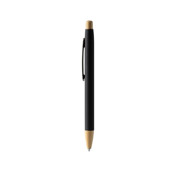 Rubber-finish metallic pen with push-button and bamboo details.