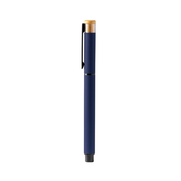 Roller ballpoint pen with recycled aluminium body, metal clip and bamboo detail.