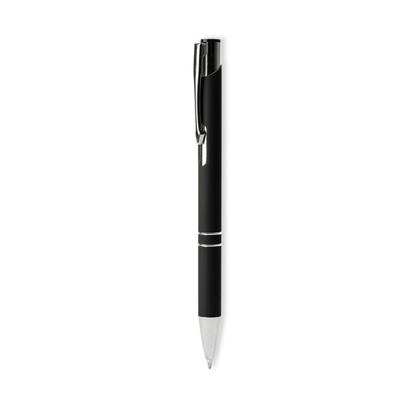 Ball pen with soft touch metal body and pusher with anodized finish.